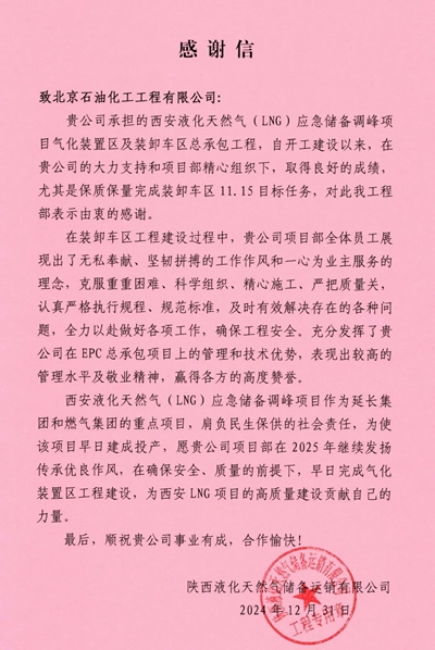 近日,北京石油化工工程有限公司收到來自陜西液化天然氣儲(chǔ)備運(yùn)銷有限公司的感謝信,對(duì)我公司在西安液化天然氣(LNG)應(yīng)急儲(chǔ)備調(diào)峰項(xiàng)目(簡稱:西安LNG項(xiàng)目)11.15項(xiàng)目節(jié)點(diǎn)建設(shè)期間全體參建人員不分晝夜,不斷投入機(jī)械和人力,以“向白晝爭分秒,向黑夜要時(shí)間”的拼勁,保質(zhì)保量完成裝卸車區(qū)工程目標(biāo)表示感謝。